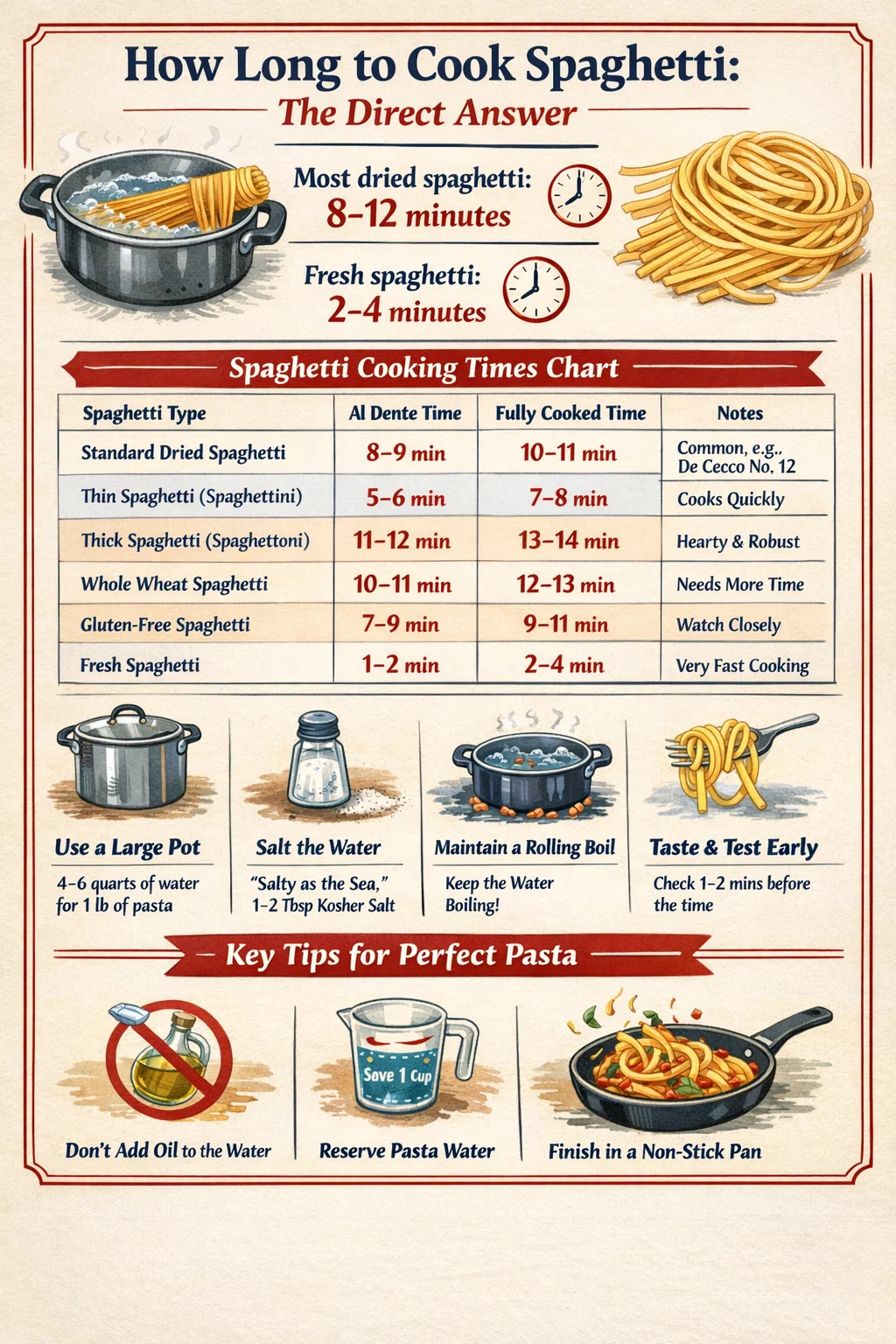 ほとんどの乾燥スパゲッティはかかります 8~12分 厚さと好みの食感に応じて、沸騰した塩水で調理します。イタリア料理のゴールドスタンダードであるアルデンテの場合は、パッケージの範囲の下限、通常は約 8 ~ 9 分を目指します。新鮮なスパゲッティは通常よりも早く調理できます。 2~4分 。全粒粉スパゲッティは、ゴム状にならずに適切に柔らかくなるまでに 10 ~ 12 分かかります。