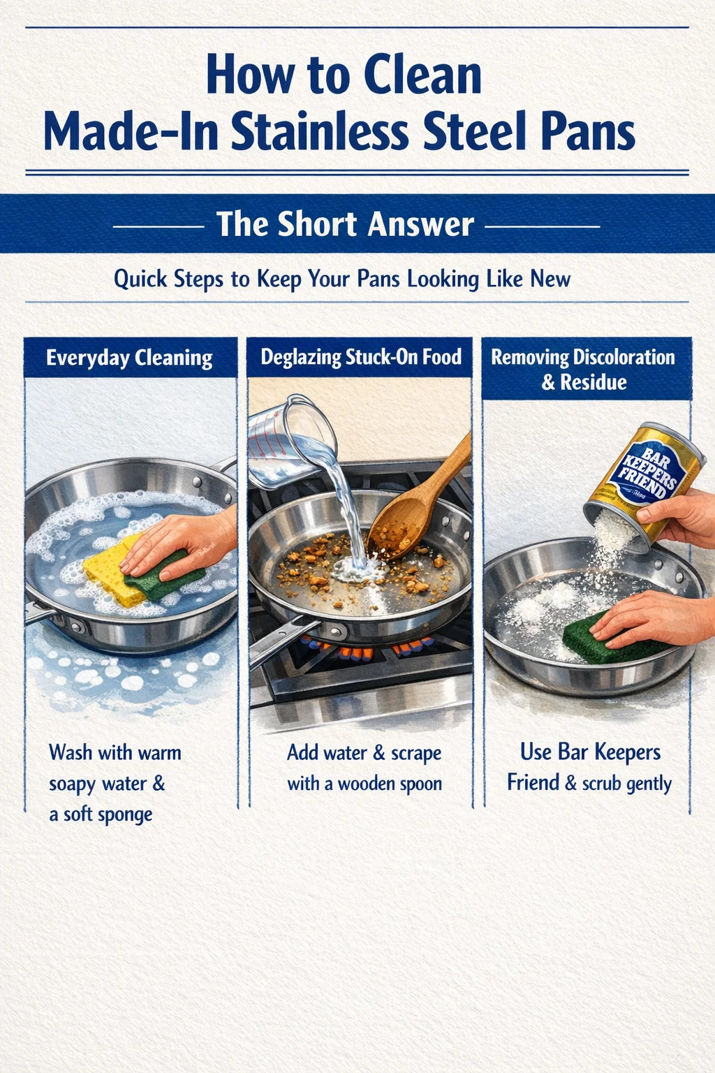 Made-In はステンレス製調理器具に永久保証を提供していますが、研磨パッドによる傷や漂白剤による変色など、不適切な洗浄による外観の損傷は保証されません。保証は、接着層の剥離やハンドルの故障などの製造上の欠陥に適用されます。このガイドの方法を使用して鍋を清潔に保つと、長期的なパフォーマンスと保証が有効な状態の両方が保証されます。