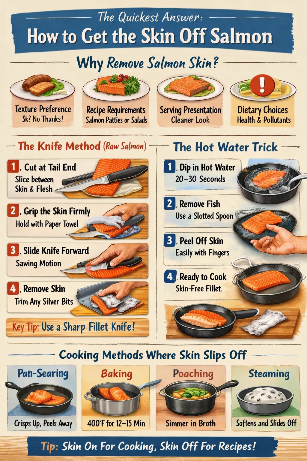 包丁のテクニック、熱湯のコツ、皮をスルッと剥がす調理方法、正しい焼き方など、実践的なアプローチをすべて網羅しています。 鍋とフライパン 調理前に鮭の皮を剥く必要がまったくなくなります。