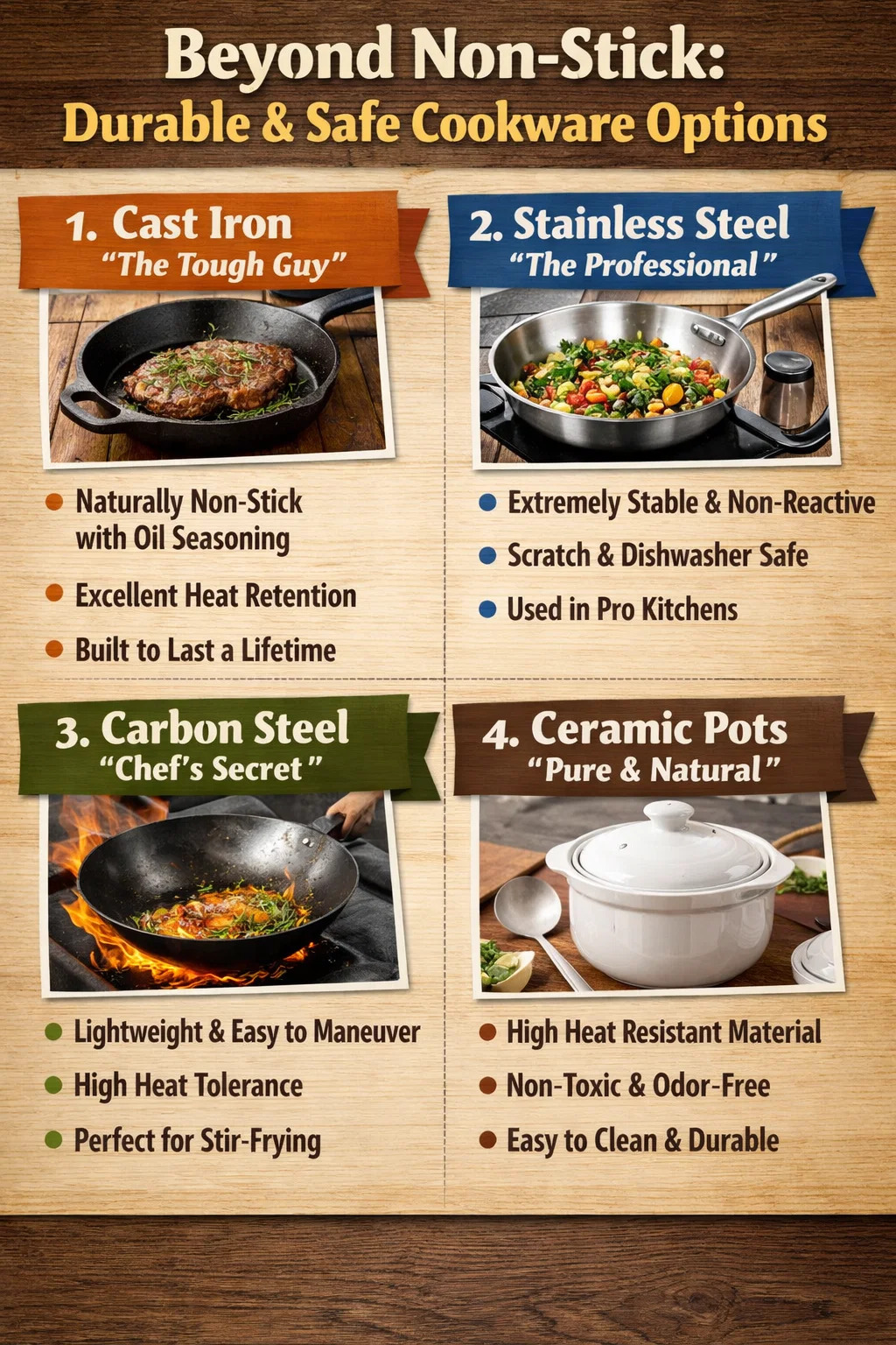 モダンでありながら、 こびりつかない調理器具 通常の使用では安全ですが、コーティングの剥離や高温の問題を心配することなく、完全に安心できる調理器具をお探しの場合は、より堅牢で信頼性の高い代替品がいくつかあります。
